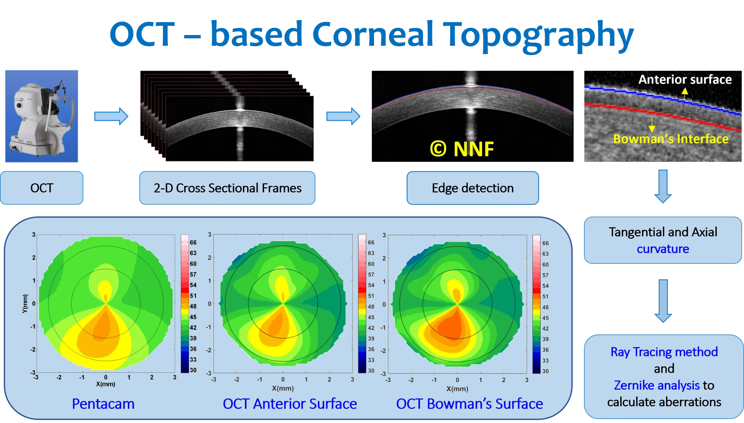 Optical coherence tomography (OCT) produces detailed cross-sectional images of the eye and is central to diagnosing conditions like keratoconus, glaucoma, macular degeneration, and diabetic retinopathy. IBMS develops next-generation imaging tools and automated algorithms for quantitative evaluation of both corneal and retinal OCT images. In corneal imaging, IBMS was among the first in the field to develop anterior corneal and Bowman’s layer topography and aberration maps from high-resolution OCT.