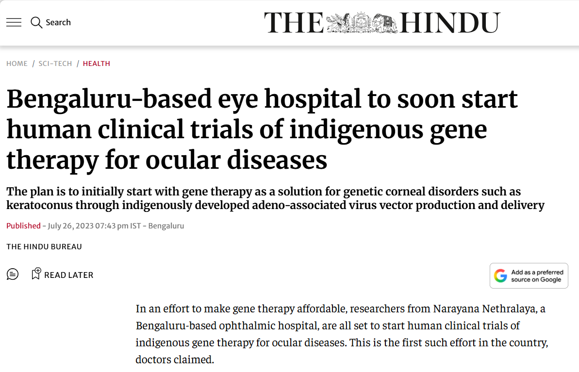 Bengaluru-based eye hospital to soon start human clinical trials of indigenous gene therapy for ocular diseases