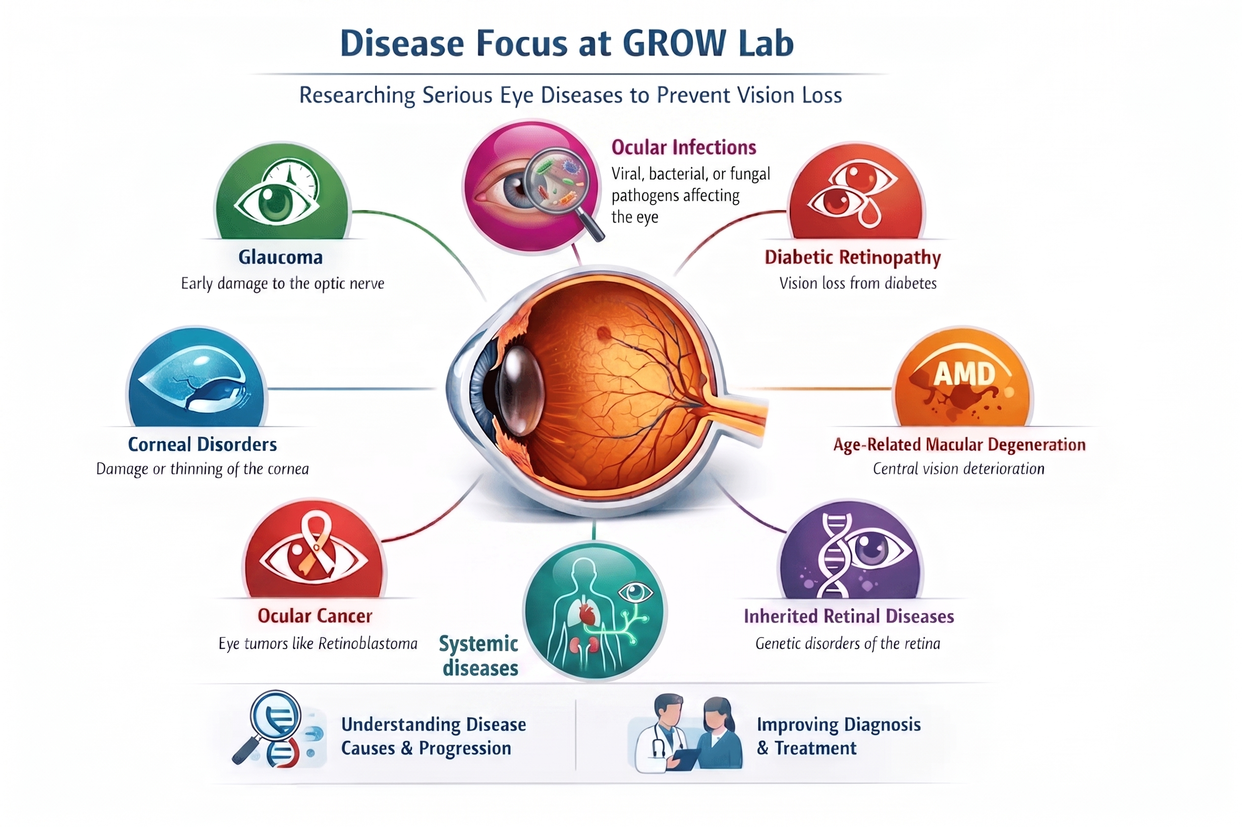 The GROW (Genes, Repair and Regeneration in Ophthalmic Workstation) research unit at Narayana Nethralaya, in collaboration with IBMS (Imaging, Biomechanics and Mathematical Modelling Solutions Lab), has delivered impactful scientific and clinical outcomes that strengthen precision eye care and genetic medicine. This work has contributed to the development of indigenous, cost-effective gene therapy platforms for ocular genetic diseases such as keratoconus, retinitis pigmentosa, and age-related macular degeneration, with the aim of significantly reducing treatment costs compared with global therapies. In parallel, this research has led to non-invasive diagnostic innovations, including tear-based biomarker panels and AI-supported models, enabling earlier detection, improved prediction of disease progression, and more personalised treatment decisions.